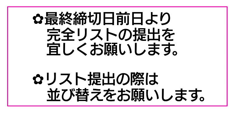 ◆締切日前日からは「暫定リスト」ではなく「完全リスト」の提出をお願いします。